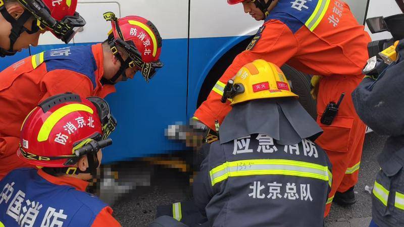 旺鼎策略 男子腿卡大巴车底 北京东城消防用液压顶杆撑出生命空间
