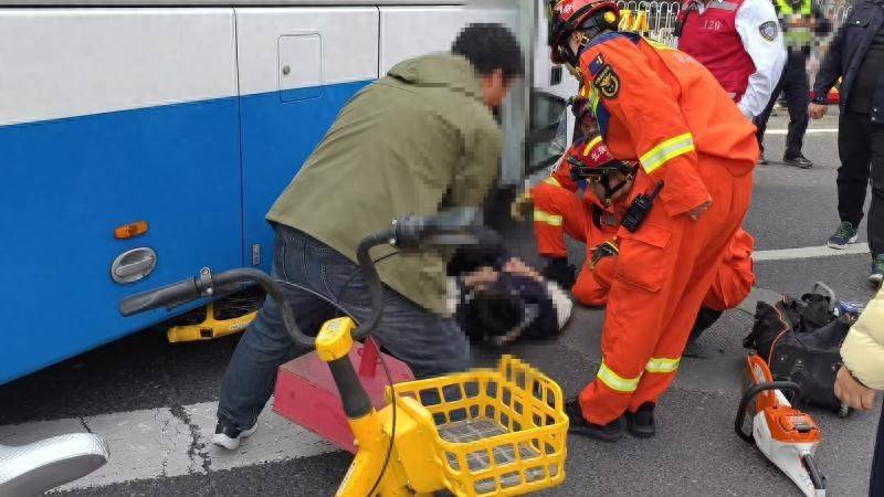 13时19分,救援力量抵达。现场勘察发现,一名30多岁的男子在骑自行车通过路口时,被一辆正在转弯的大巴车剐倒,其左腿被卡在车辆前轮旁。被困男子意识清醒,但身体无法移动。